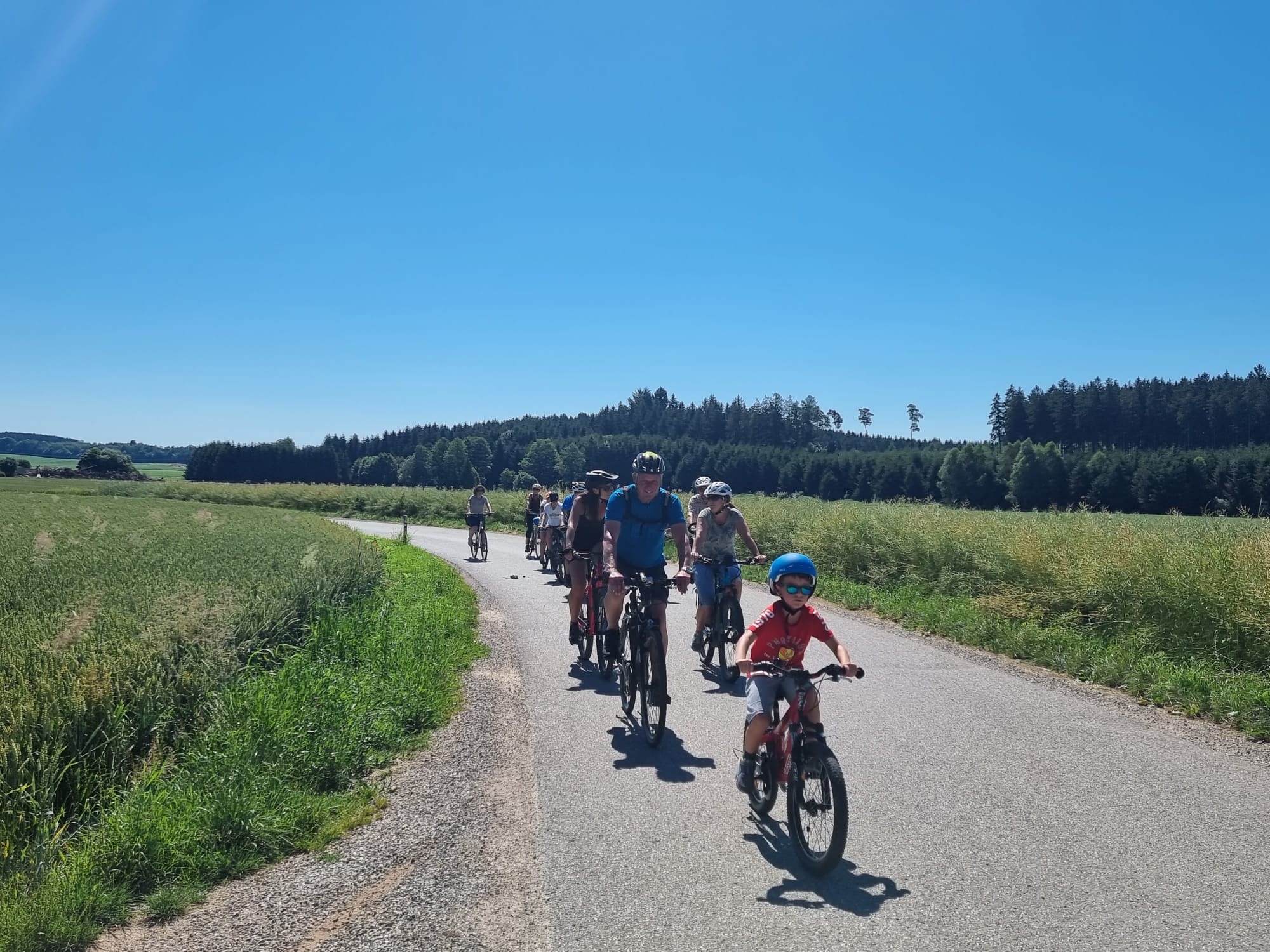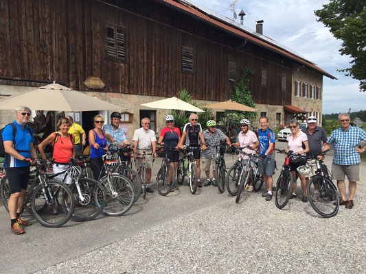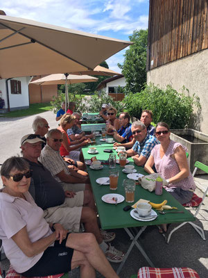 Bei schönstem Sommerwetter ging es durch Wald, über Wiesen und Felder, an Weihern vorbei, leicht hügelig durch den Pfaffenwinkel zwischen den Osterseen und dem Staffelsee. Immer wieder genossen wir den Ausblick auf die bayerischen Alpen, Kühe und Pferde. Nach gut dreiviertel der Strecke gab es eine Abkühlung im Habacher Weiher. Danach haben wir uns Kaffee und Kuchen (Bier gab es auch) im Bauernhof-Museumskaffee in Reinthal verdient, denn es heißt nicht ohne Grund "Genuss-Tour".