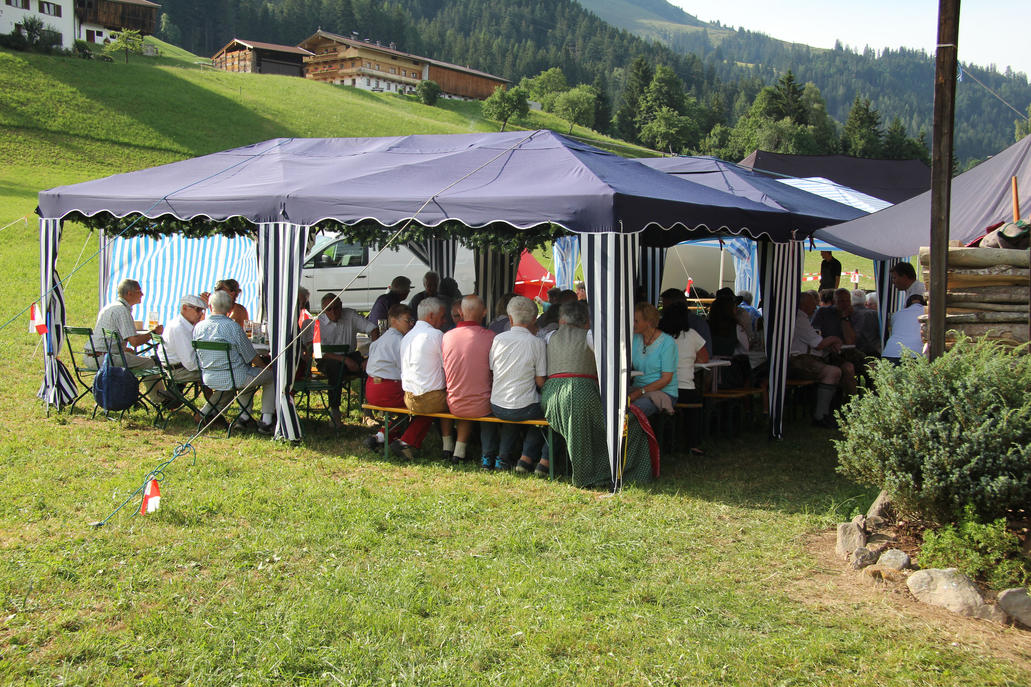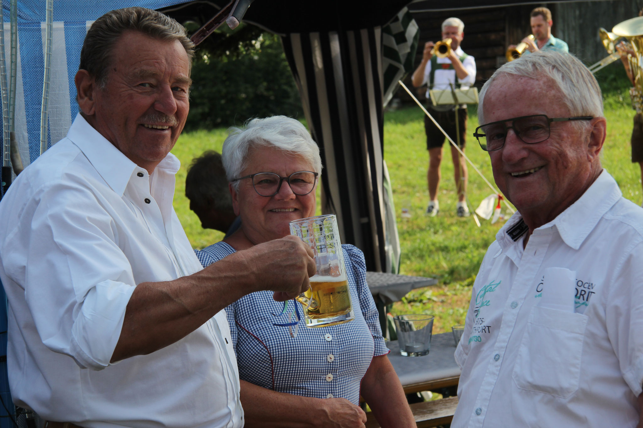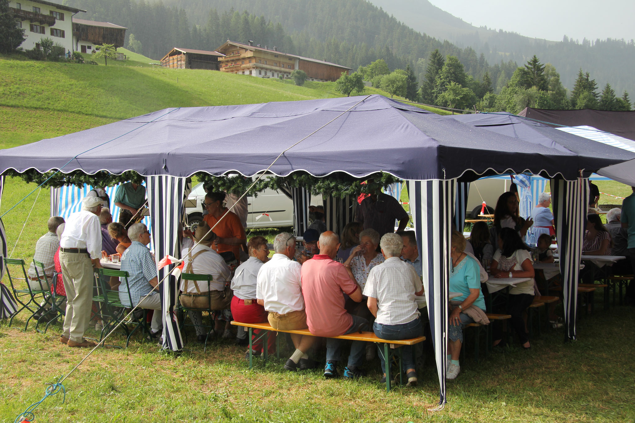 Die Organisation hatte im Vorfeld wahrhaft ganze Arbeit geleistet und so konnten wir bei Sonne und manchmal auch etwas Regen gut behütet das ausgezeichnete Essen der Kirchberger Metzgerei Trixl & Straif und die erfrischenden Getränke genießen. Die Blasmusik begleitete uns bis in den Abend hinein durch das Programm und verabschiedete sich dann schließlich, nicht ohne einen herzlich hopfigen Abschiedsgruß unserer Damen.
