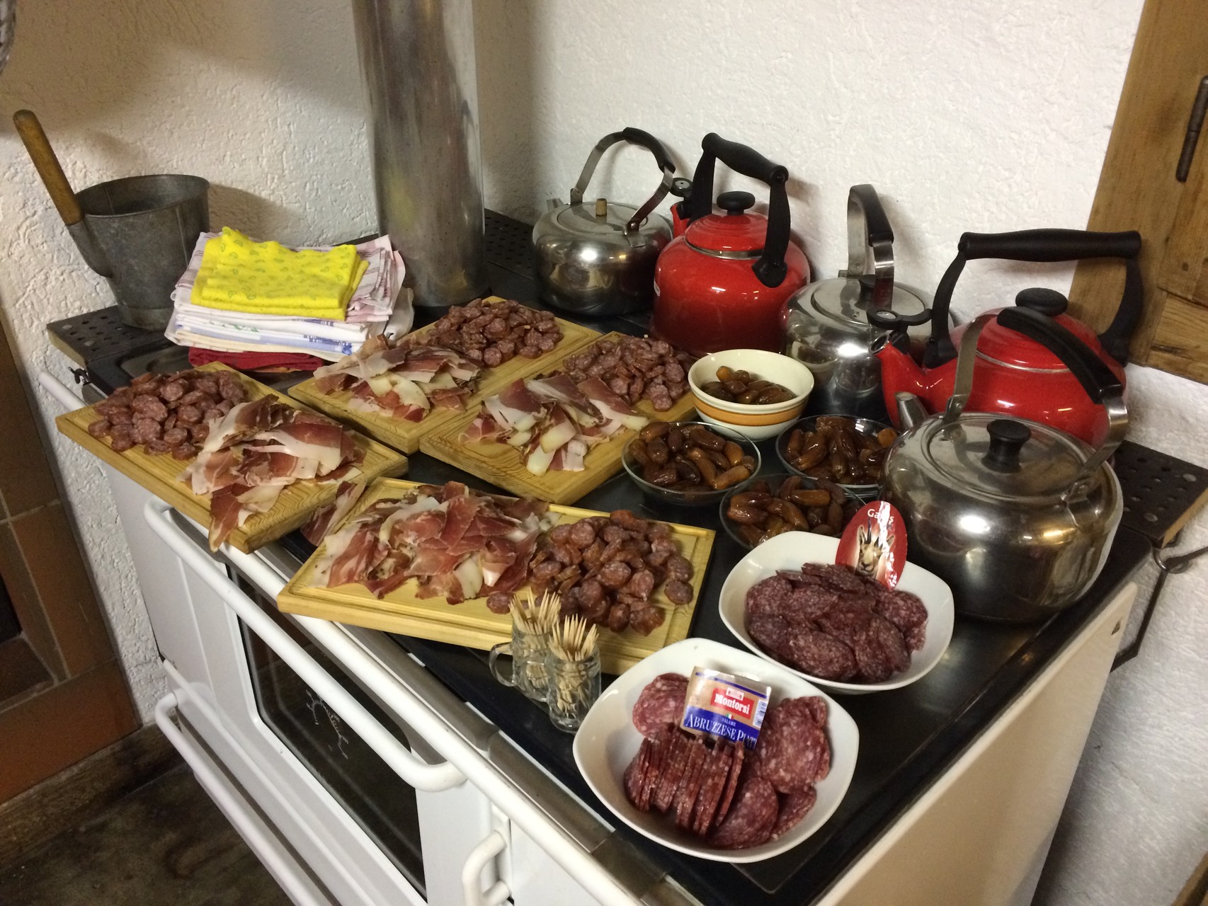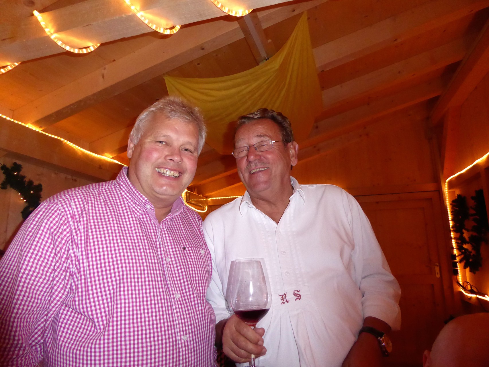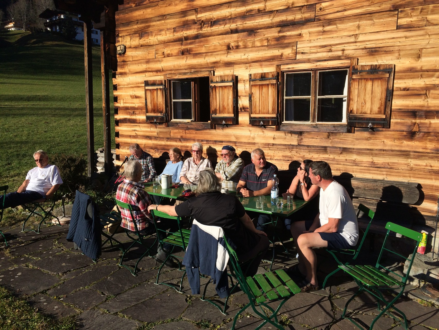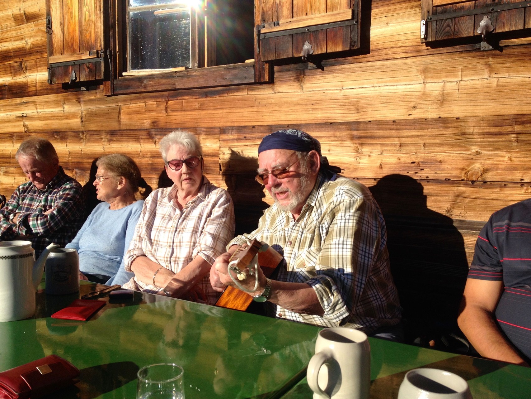 nachmittags in der Herbstsonne auf der Hüttenbank. Gegen 18 Uhr waren die meisten Gäste eingetroffen, ein paar Nachbarsbauern sind ebenfalls gekommen. Alle waren begeistert von der schönen