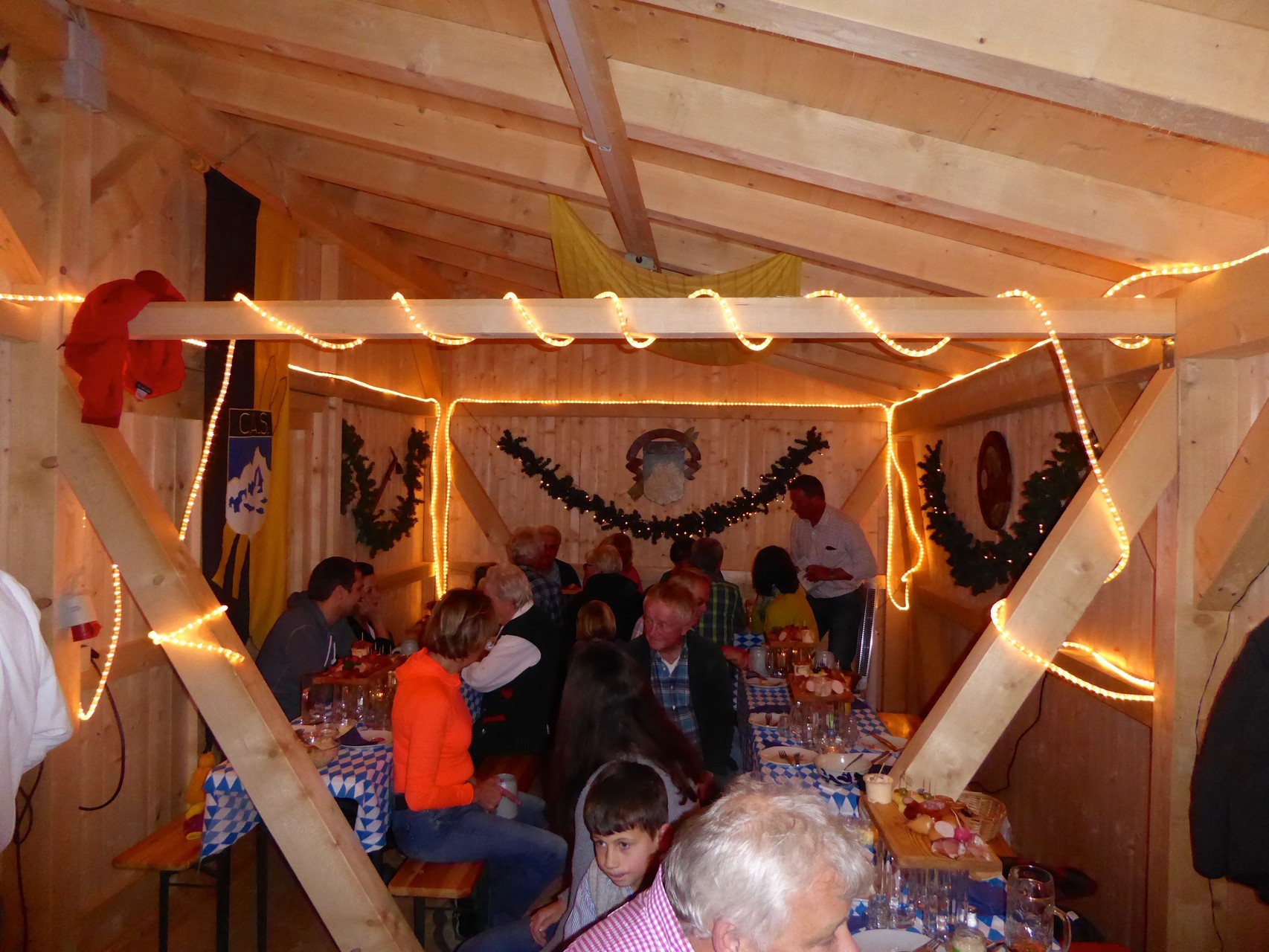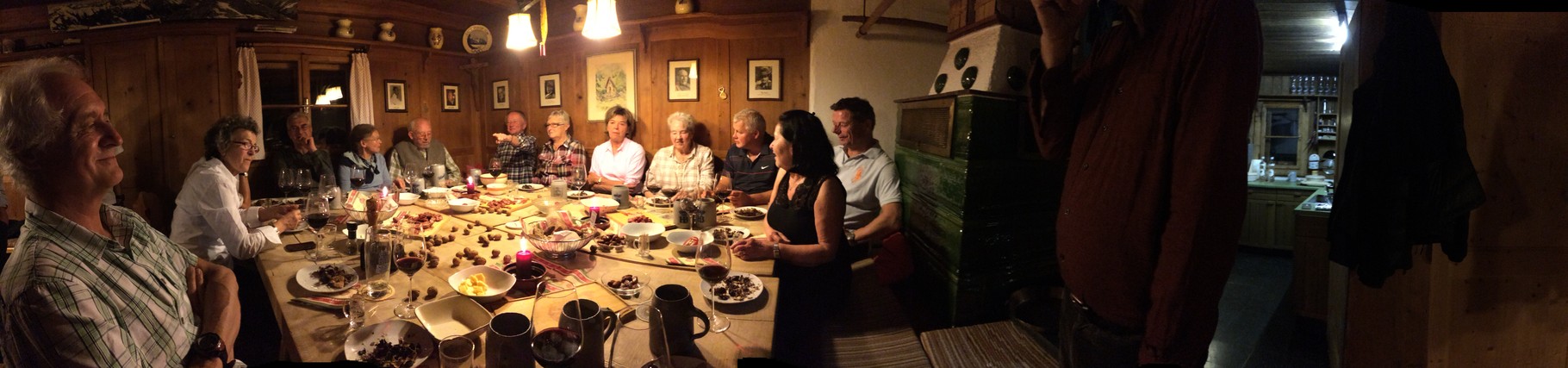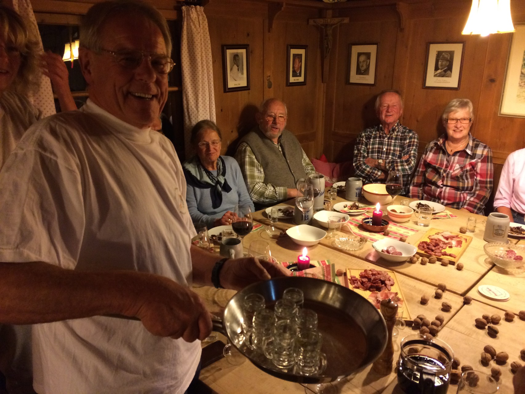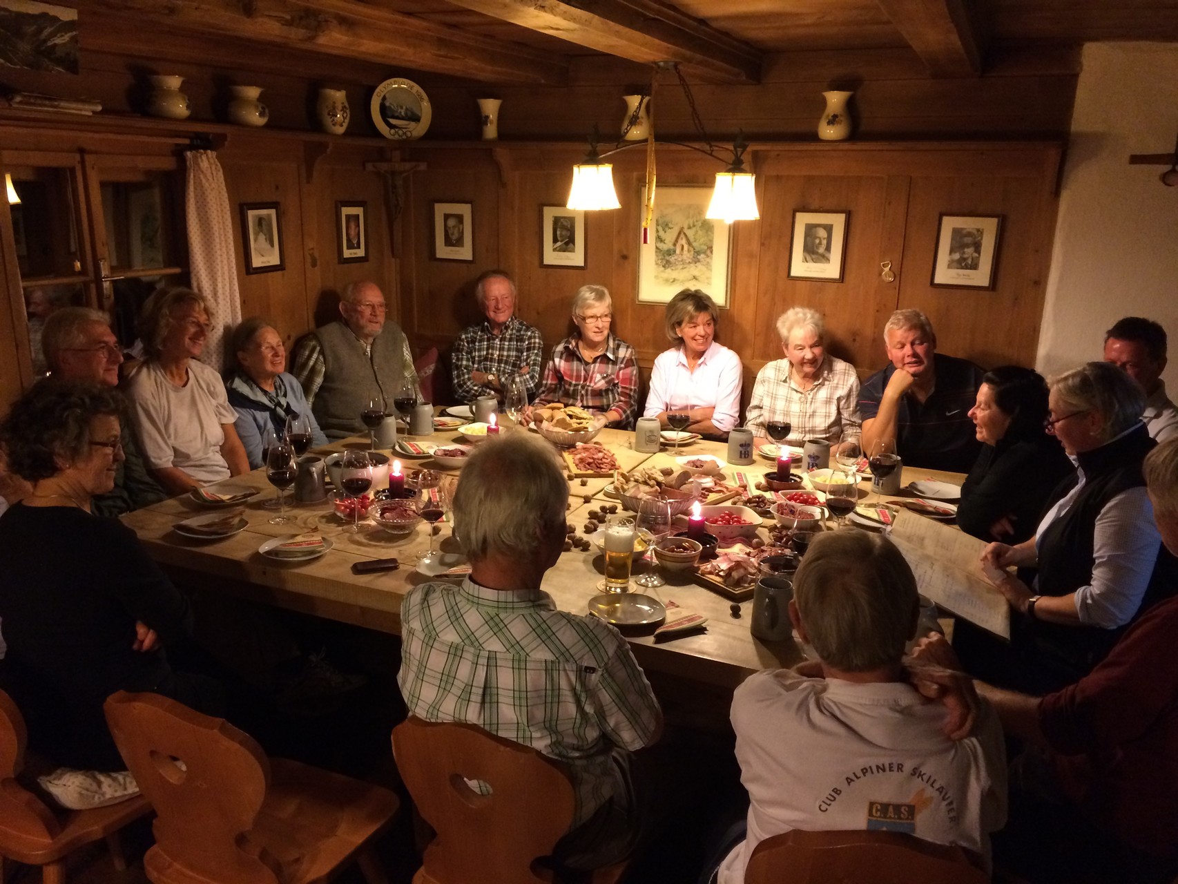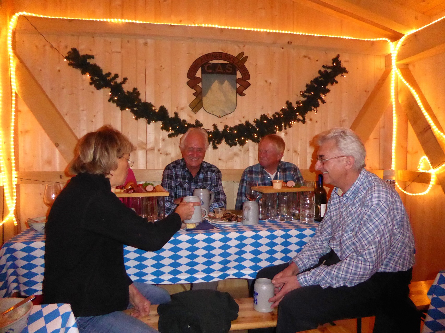 Im Jahre 2013 wurde unsere CAS-Hütte 75 Jahre alt. Die im Herbst 2013 geplante Jubiläumsfeier musste leider wegen Krankheit entfallen.Jetzt wurde die Feier am 22. November 2014 mit einem Törggelen-Abend auf der Hütte nachgeholt. Der Ehrenvorsitzende Bernhard und seine Familie sorgten für Wein, Speck, Maroni und Schüttelbrot. Der launige Abend wurde noch mit prickelnden Beiträgen aus der CAS-Chronik angereichert ("Schwarze Rose").Am darauffolgenden Sonntag gab es zur Stärkung noch Weißwürschte und Brezn für alle Hüttengäste. Die Bergtour am Sonntag auf den Gaisberg (1770) fand dann bei frühsommerlichen Temperaturen statt. Es wurden sogar blühender Enzian und Weidenkätzchen entdeckt.