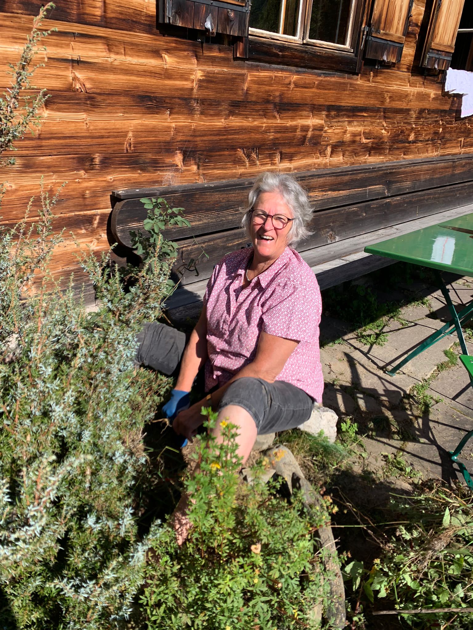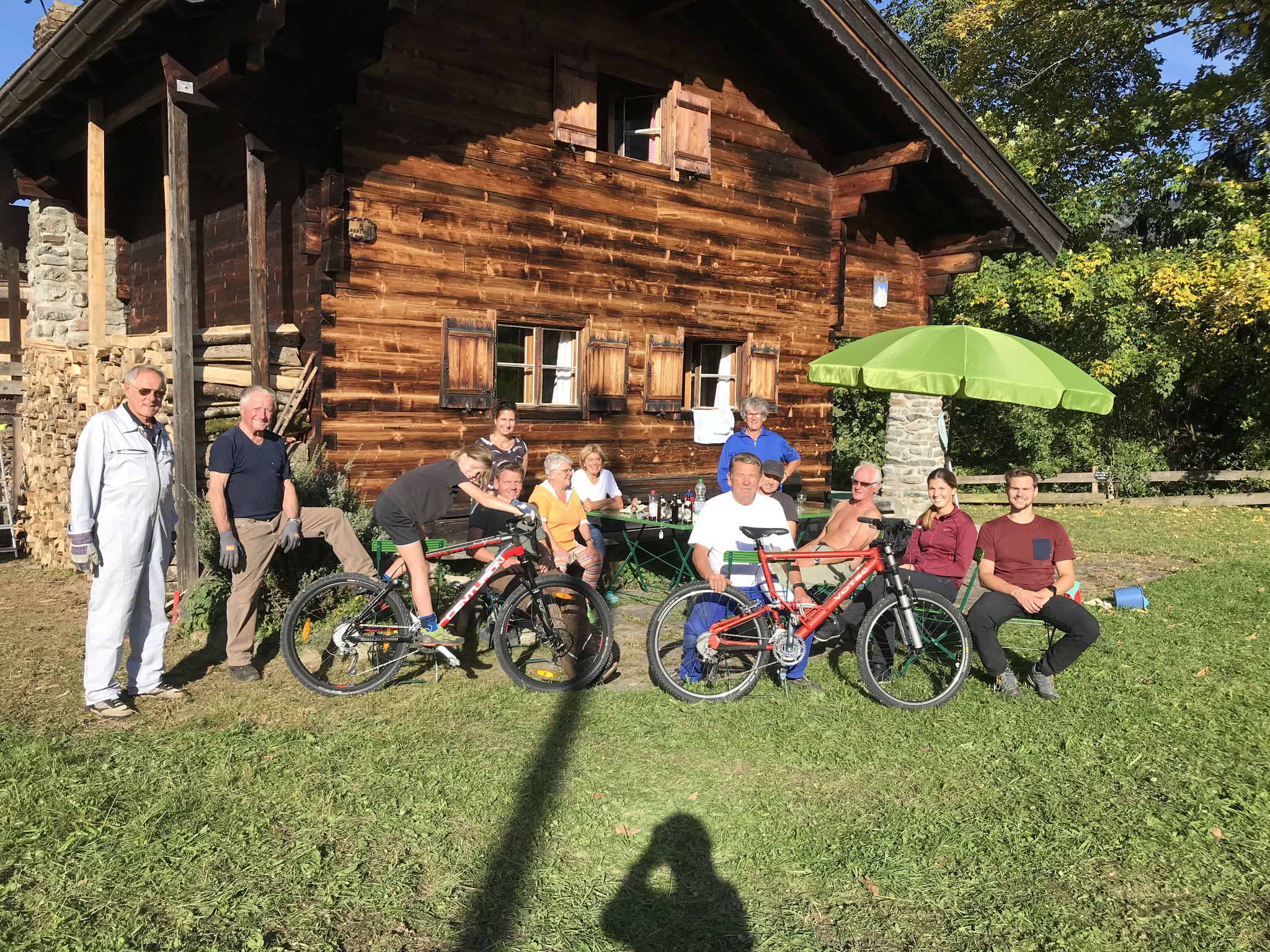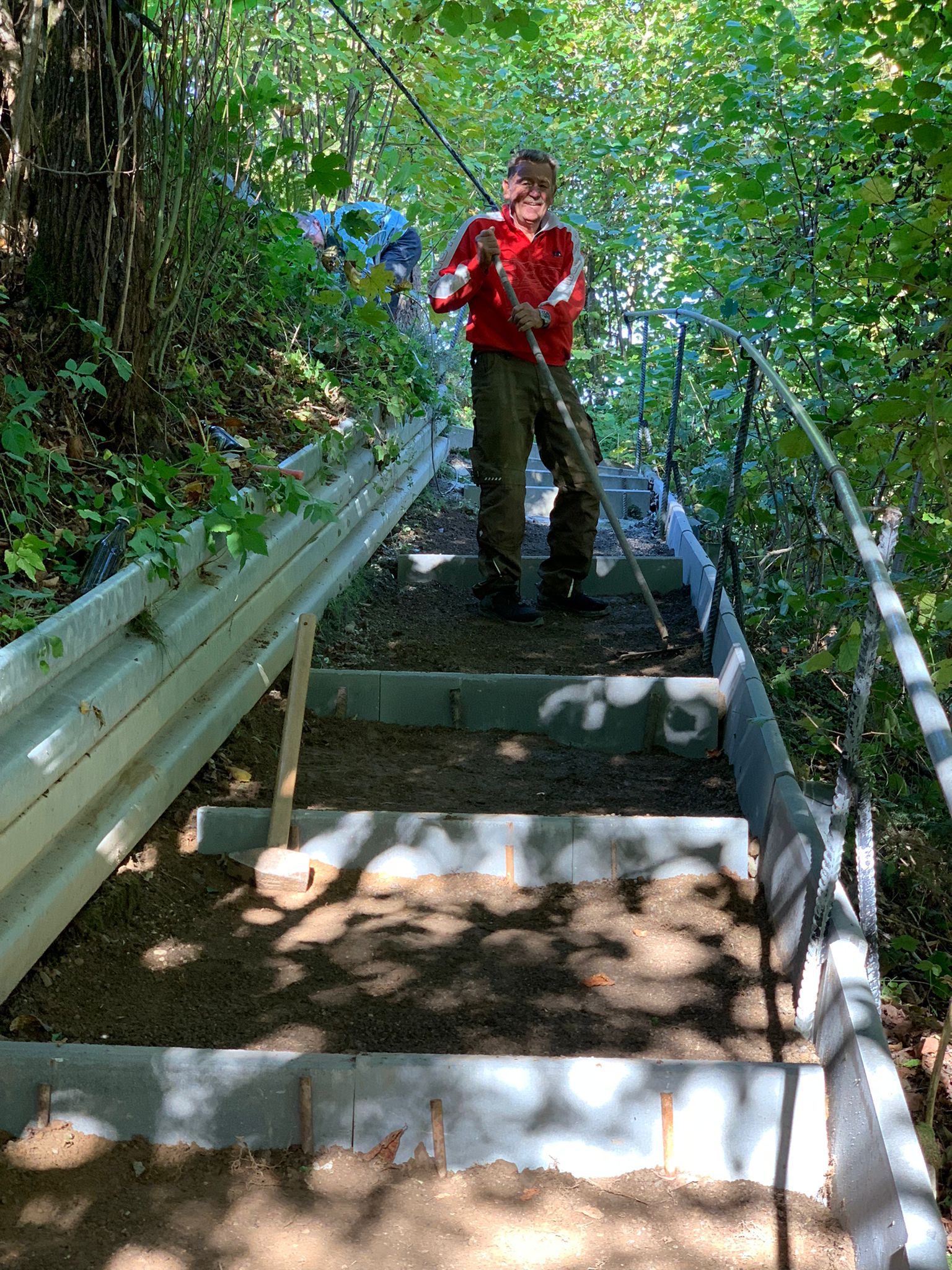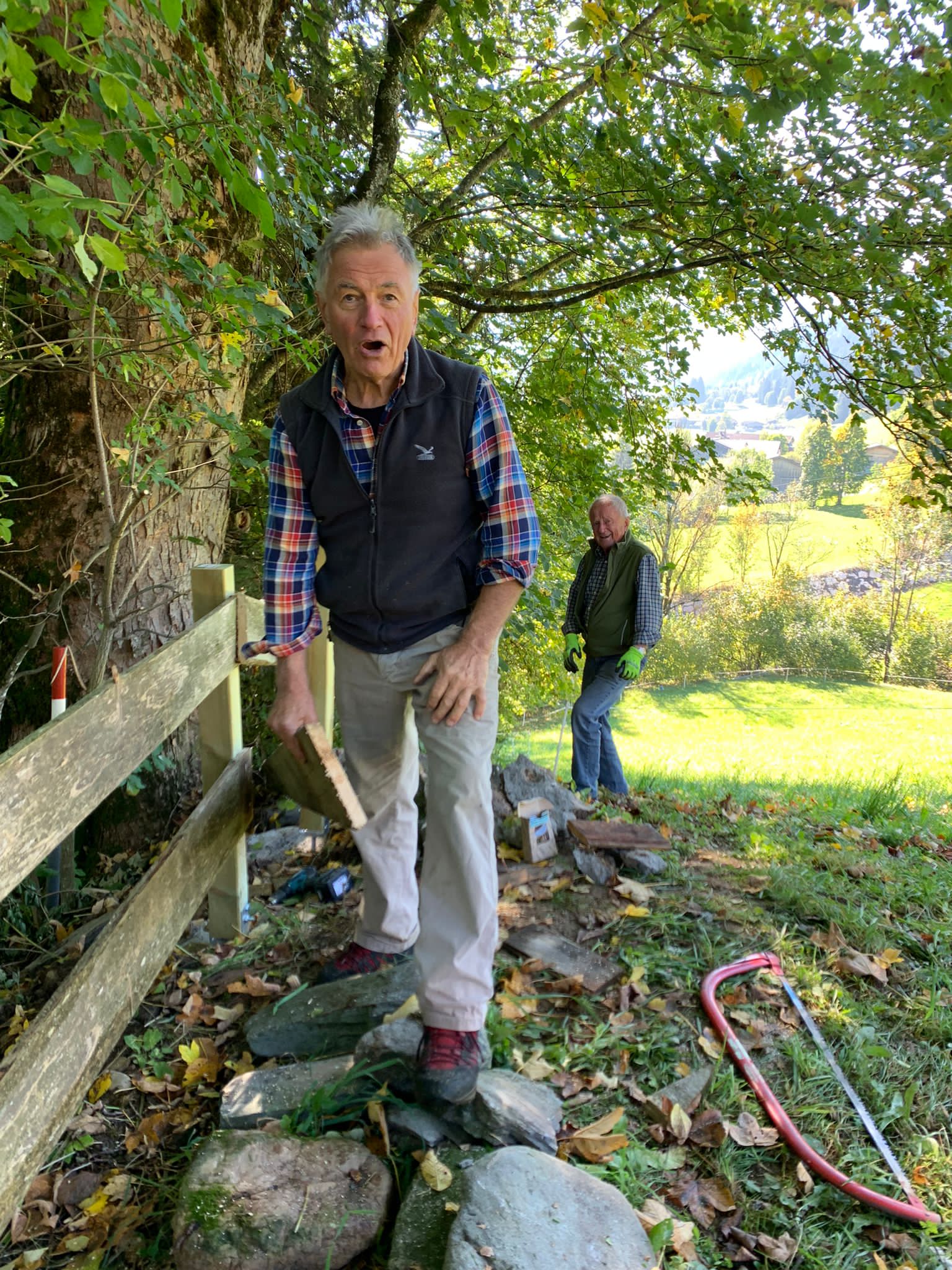 Bei strahlendem Sonnenschein machten wir uns ans Werk und waren froh, uns wieder um unsere liebgewonnene Hütte kümmern zu können, nachdem aufgrund der Coronapandemie das Hüttenstöbern und Hüttenbesuche im Jahr zuvor entfallen mussten. Unser Weg wurde nun durchgängig mit Treppenstufen befestigt.