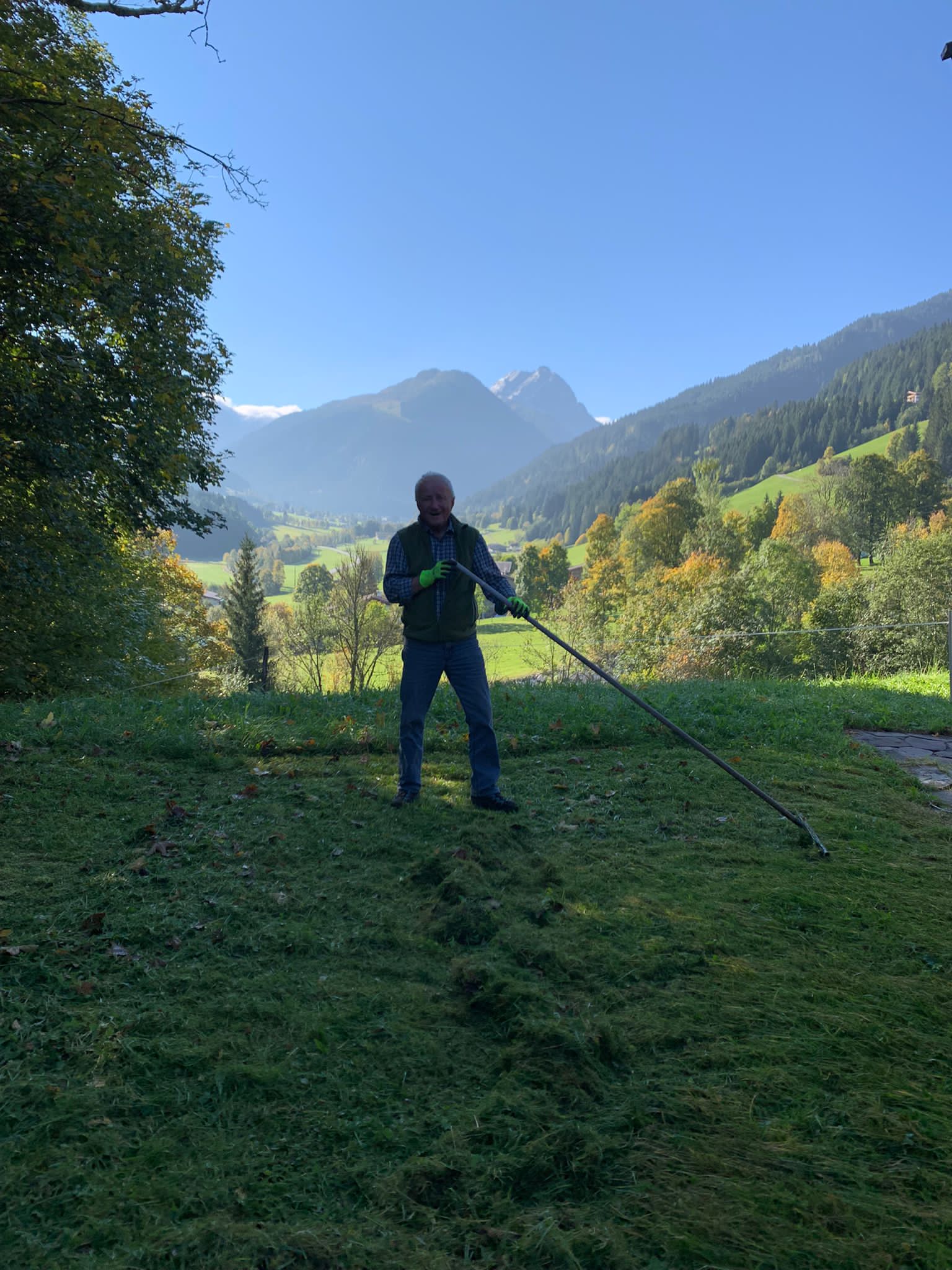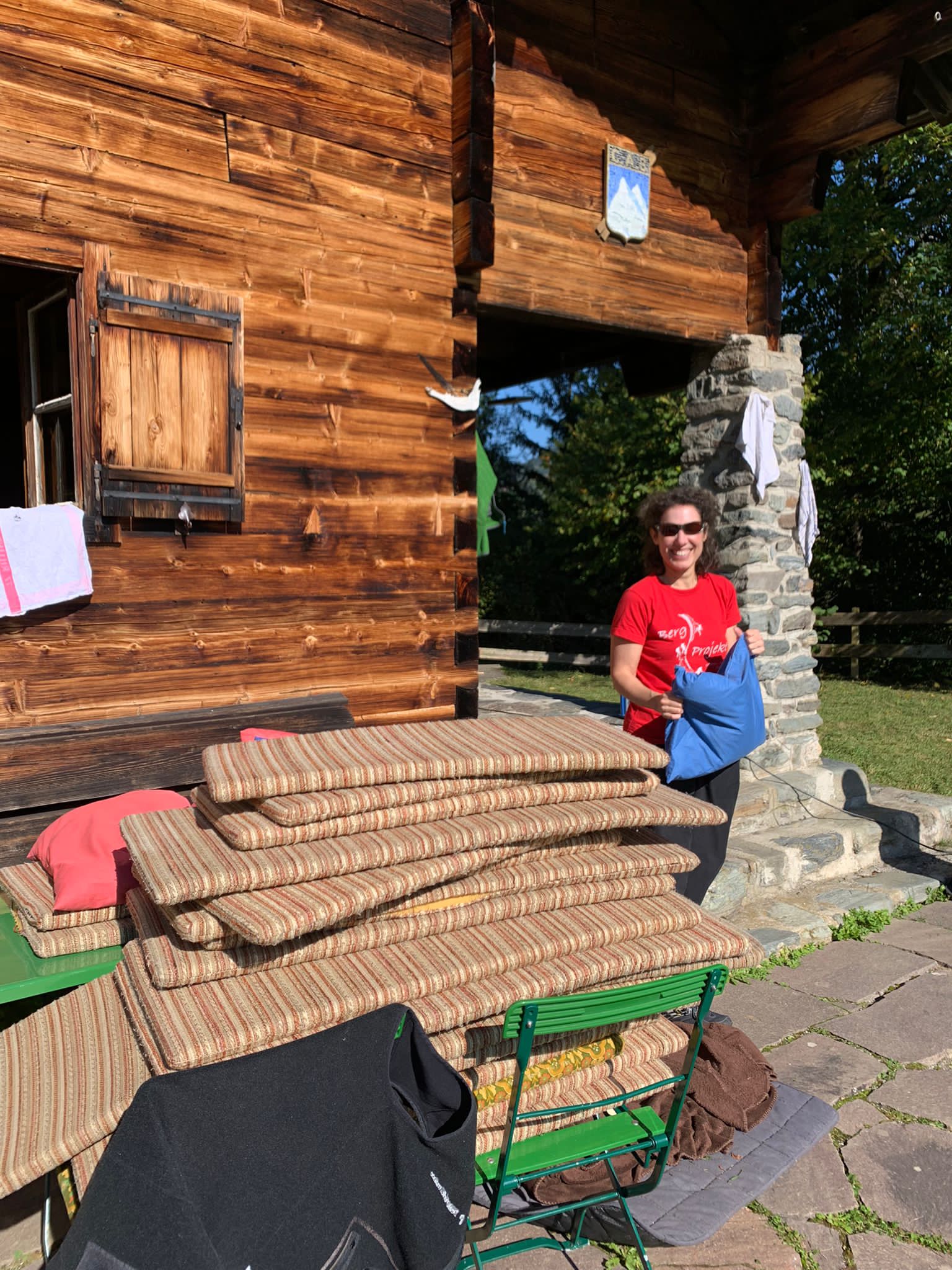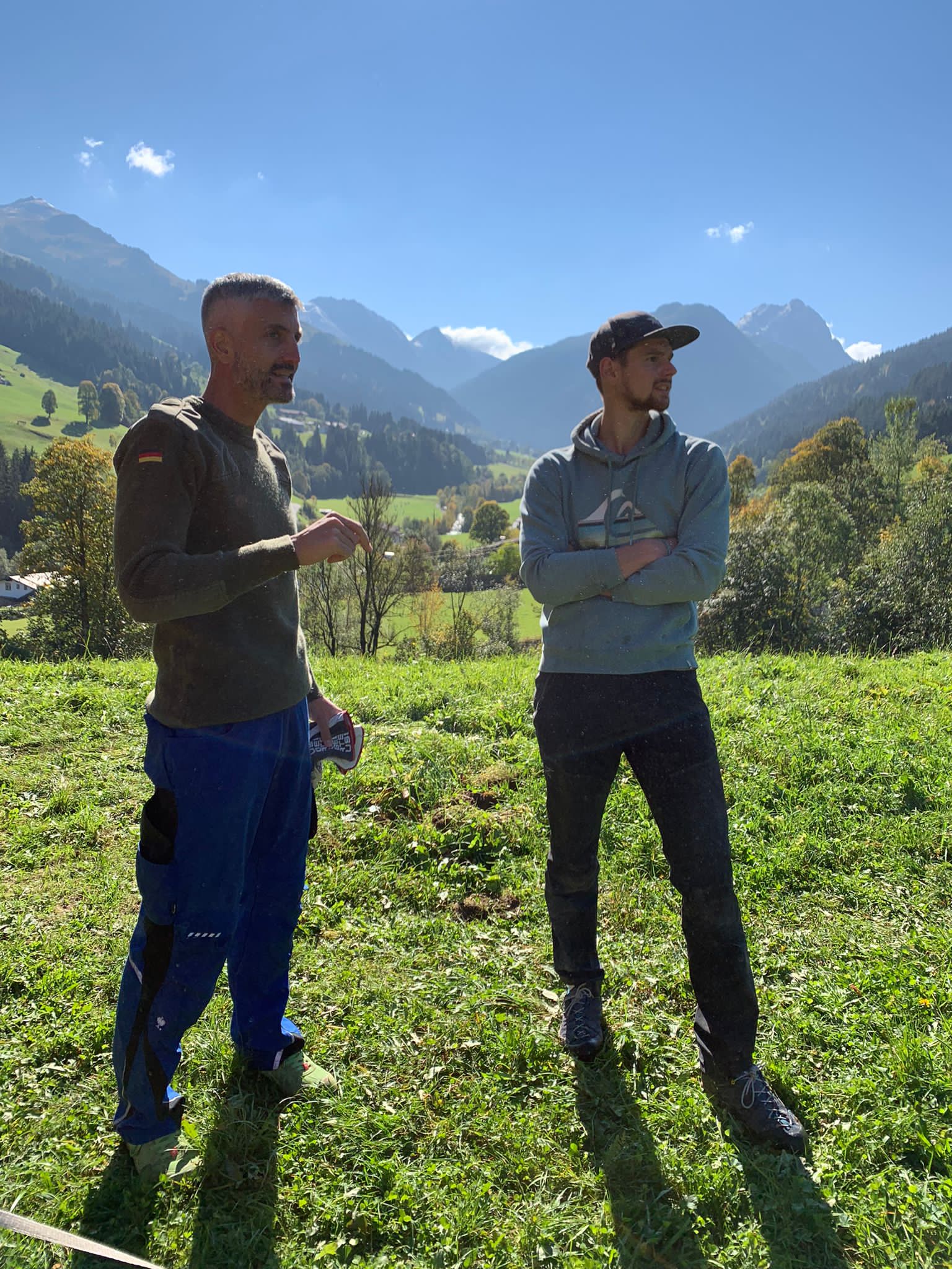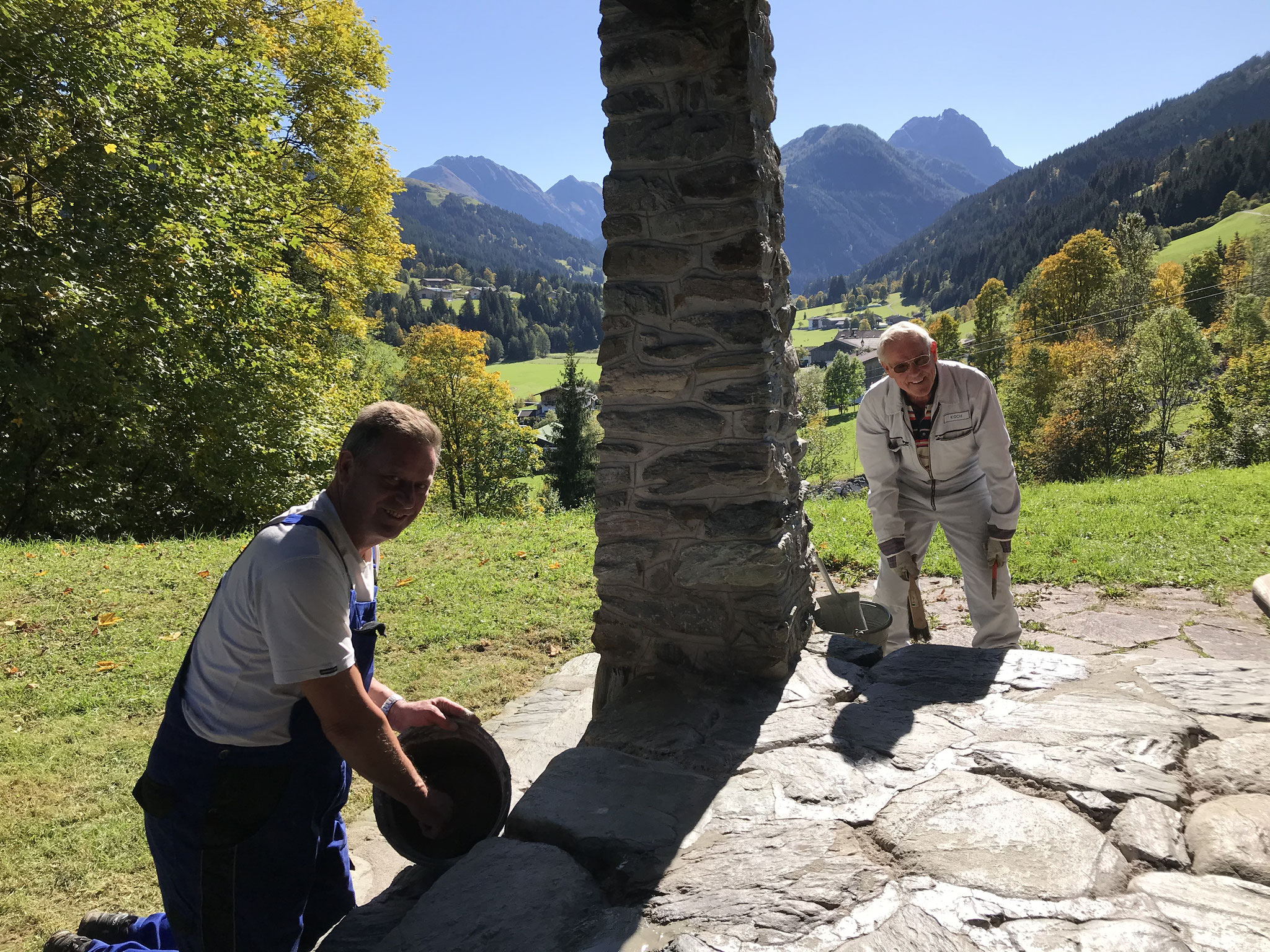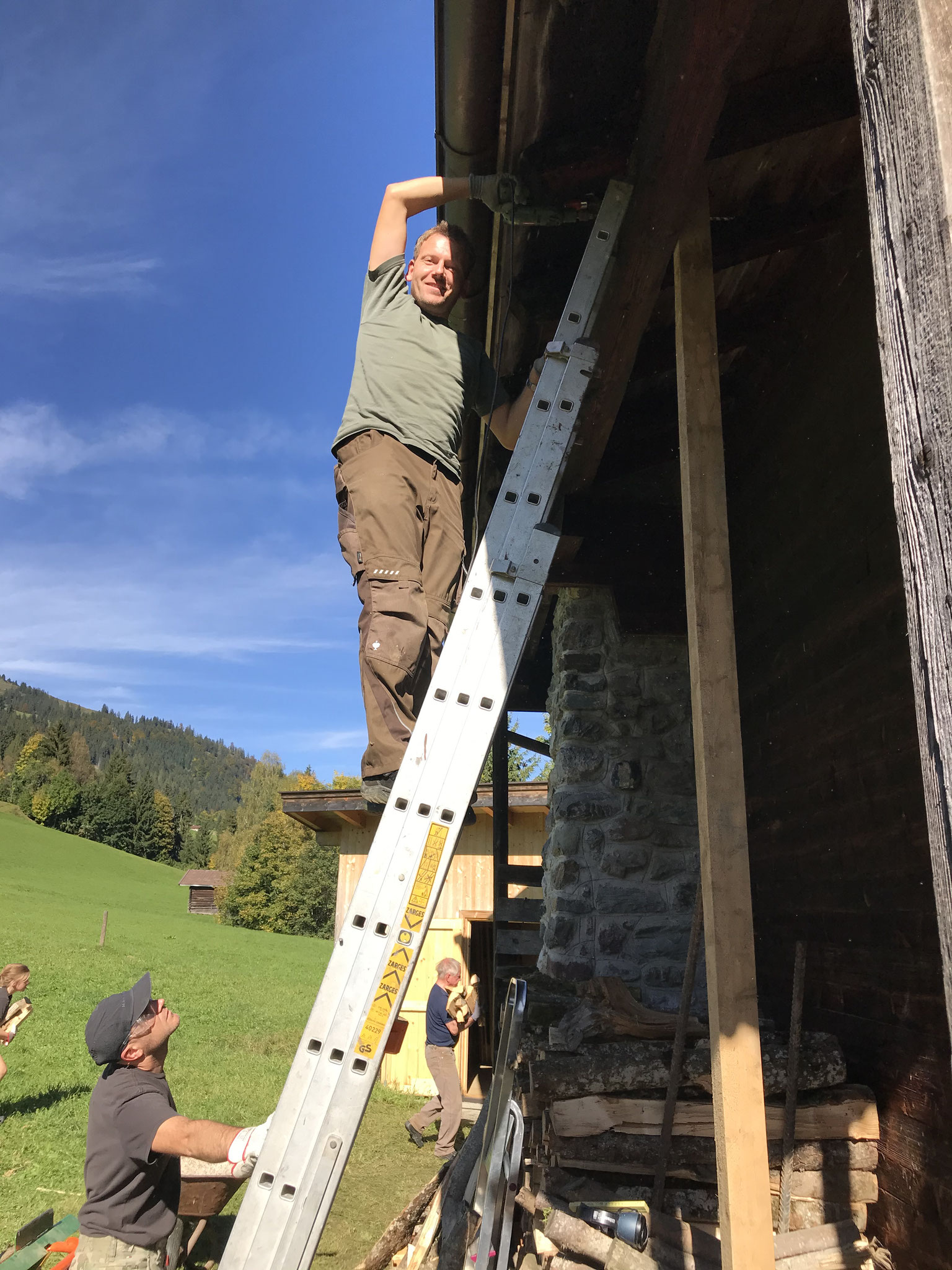 Bei strahlendem Sonnenschein machten wir uns ans Werk und waren froh, uns wieder um unsere liebgewonnene Hütte kümmern zu können, nachdem aufgrund der Coronapandemie das Hüttenstöbern und Hüttenbesuche im Jahr zuvor entfallen mussten. Unser Weg wurde nun durchgängig mit Treppenstufen befestigt.
