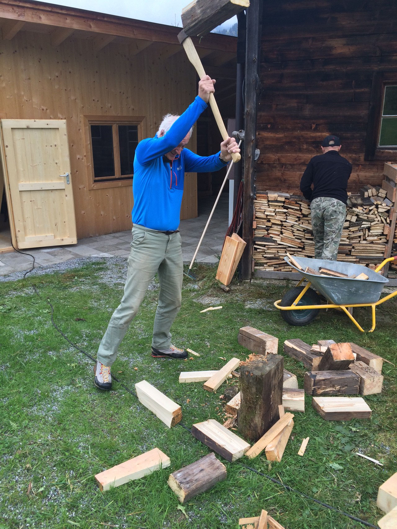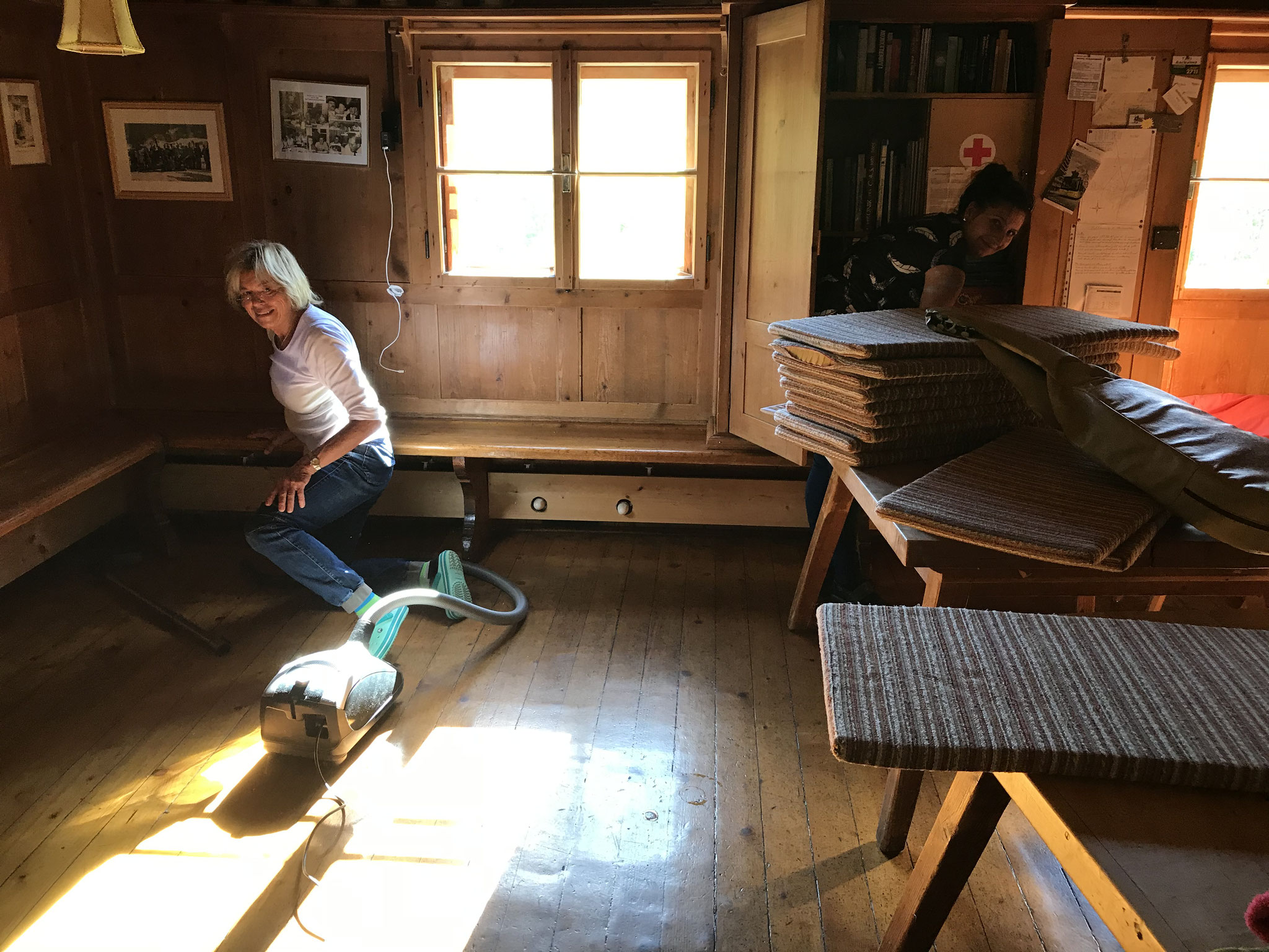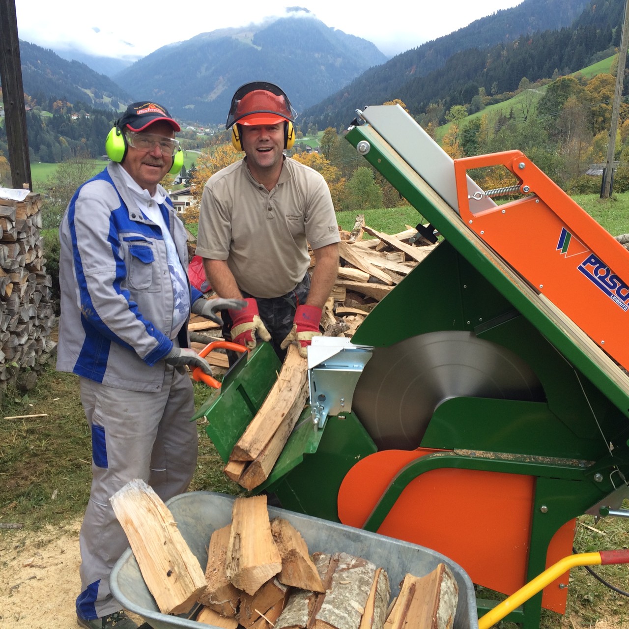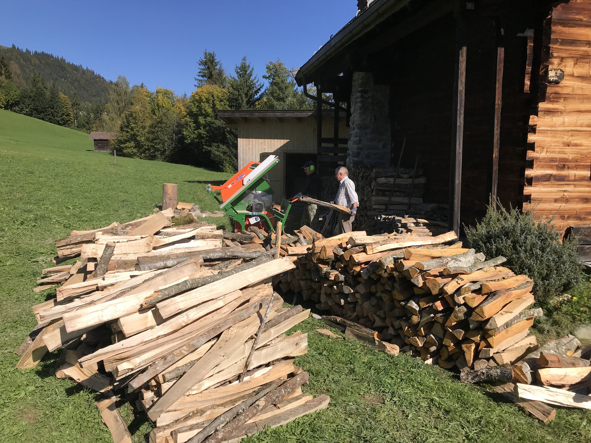Unsere gute alte Kreissäge gab gleich zu Beginn ihren Geist auf und es musste schnell ein adäquater Ersatz gefunden werden. Hüttenwart, Vorstand und zwei weitere krisenerprobte Mitglieder begaben sich sofort in Richtung Tal um eine neue Säge zu besorgen. Keine zwei Stunden später war der CAS Besitzer einer neuen "EasyCut" Wipp-Säge und es konnte sogleich weitergearbeitet werden. Gegen Abend waren knapp 10 Ster Holz gemacht und es gab in der auf Hochglanz gewienerten Hütte ein deftiges Mahl für alle Helfer.