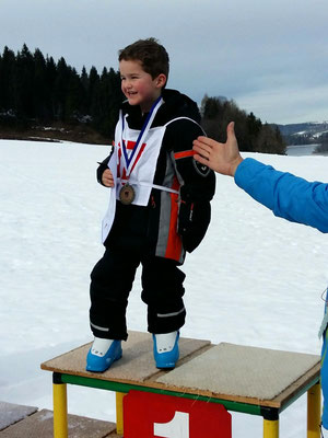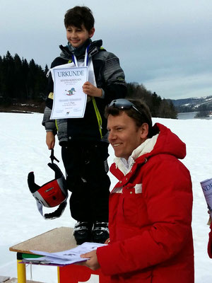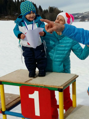 Einige Kinder haben ihre Startnummern sofort nach dem Rennen abgelegt. Jetzt müssen sie noch einmal angelegt werden für die Siegerehrung. Weil eine Siegerehrung ohne Startnummer nicht geht. Erwartungsvoll stehen die Kinder neben dem hohen Siegerpodest. Andi ruft ein Kind nach dem anderen auf. Jedes darf ganz oben hinaufklettern auf den Siegerplatz. Franz hängt jedem Kind eine Medaille um, wofür der Helm abgenommen werden muss, weil die Medaillen-Bandl nicht weit genug sind für so einen großen Helm. Andi übergibt die Urkunde: „Gratulation!“ Siegerfotos werden geknipst. Es muss dir warm um’s Herz werden, wenn du die Ernsthaftigkeit siehst, mit der die Kinder die Siegerehrung angehen. Sternstunde!