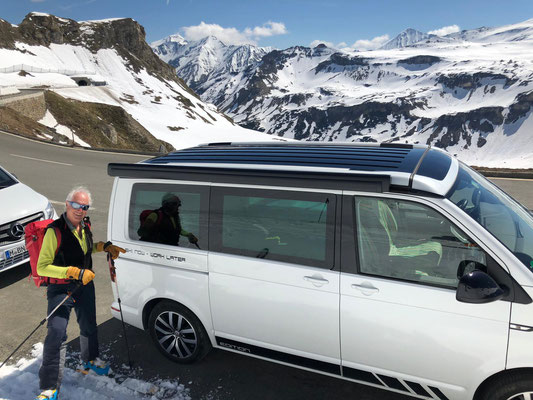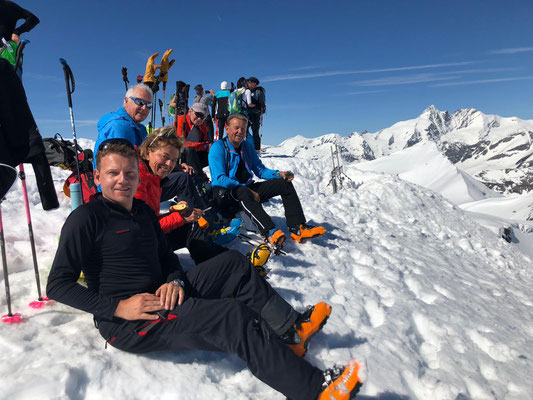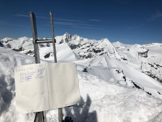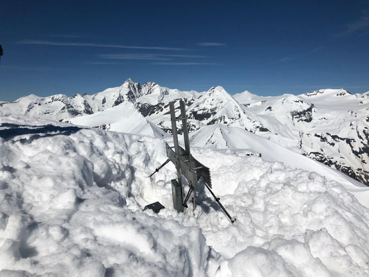 Das Gipfelkreuz ist fast komplett unter dem Schnee versteckt. Ein paar Tourengeher machen sich ein Vergnügen und graben es mit ihren Lawinenschaufeln unter viel Hallo aus. Die Sicht ist fantastisch: Der Glockner steht zum Greifen nah im Westen, markant zieht der Stüdlgrat von Süden hinauf. Ein „Stockwerk“ unter uns erkennen wir den Gipfel des Kloben. Im Süden steht der Hochschober zwischen seinen Trabanten der Schobergruppe.